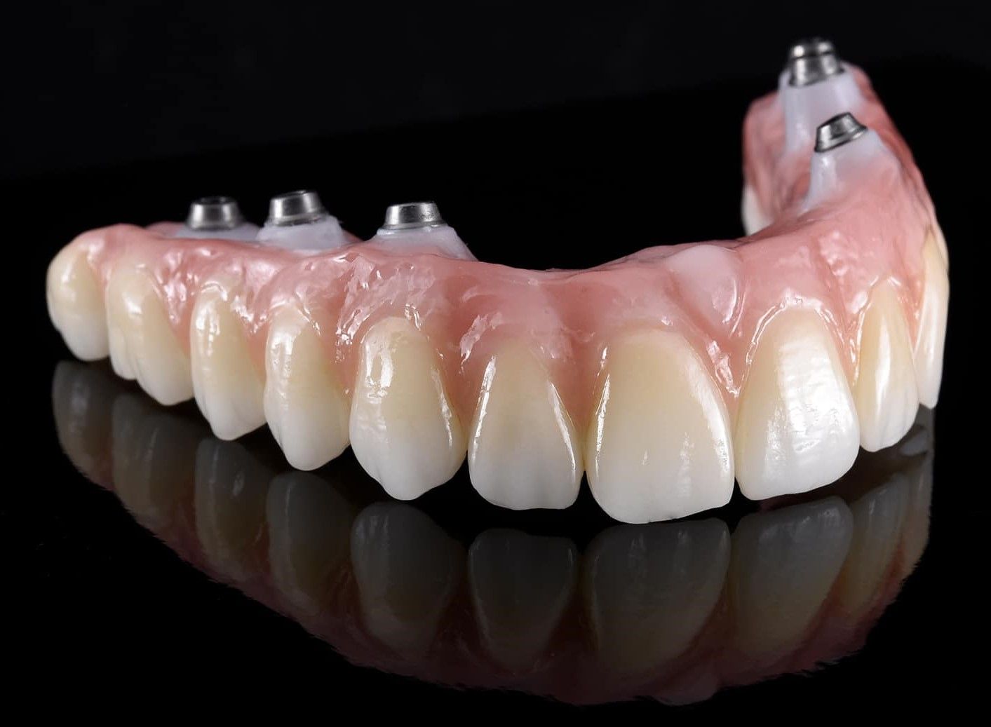 Протезы на имплантах используют при полном или значительном отсутствии зубов. В кость челюсти вживляют титановые имплантаты, которые служат опорой для протеза. Количество имплантатов зависит от клинической ситуации — от 2-4 при методике all-on-4 и до 6 при классическом подходе.