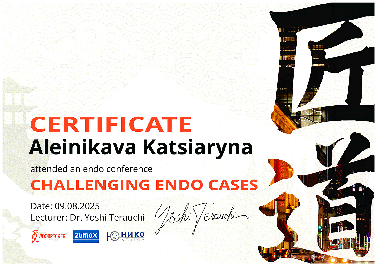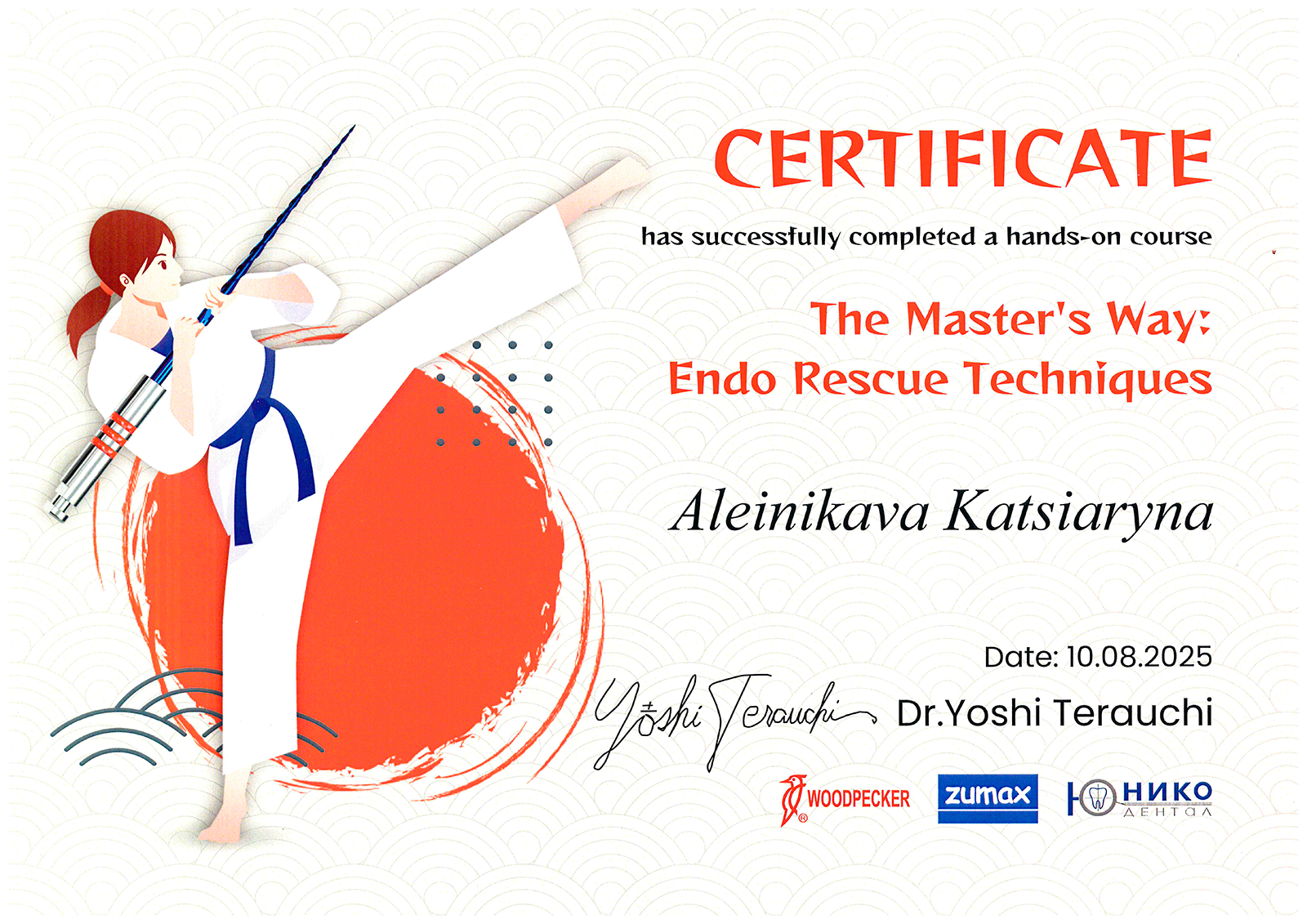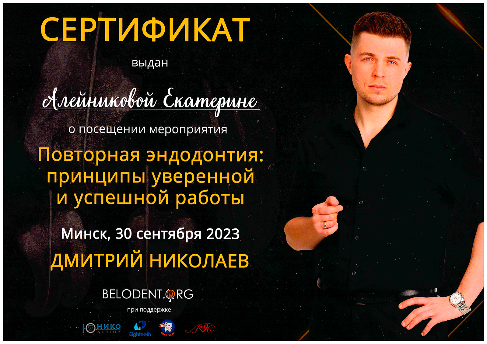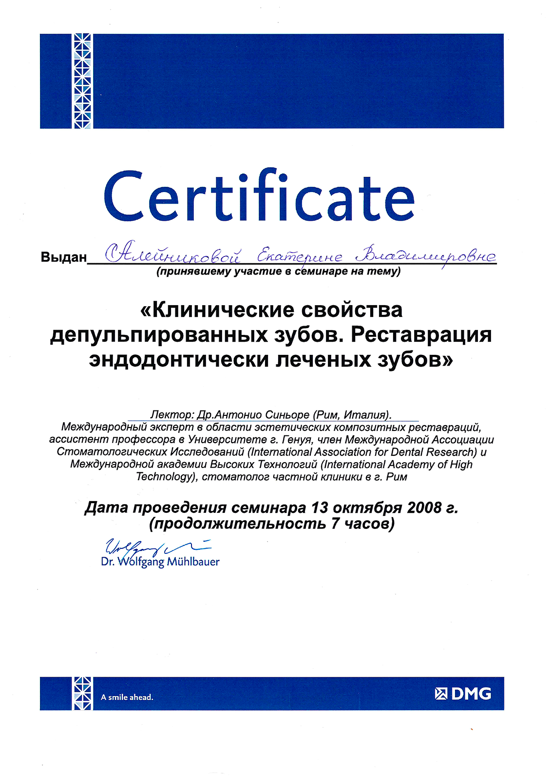 2008г. – Семинар «Клинические свойства депульпированных зубов. Реставрация эндодонтически леченых зубов», лектор Др. Антонио Синьоре (Рим, Италия, международный эксперт в области эстетических композитных реставраций, ассистент профессора в Университете г. Генуя, член Международной ассоциации Стоматологических исследований и Международной академии Высоких технологий, стоматолог частной клиники в г. Рим).