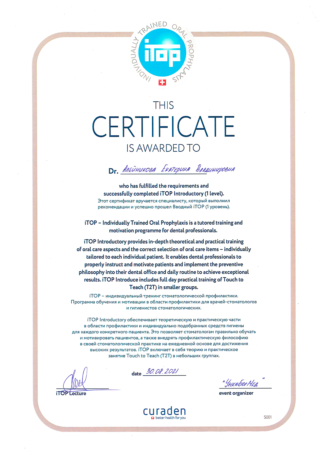 2021г. – Вводный семинар по программе iTop. Curaprox.(1уровень) Инструктор Васильчук М.С. (г. Минск).