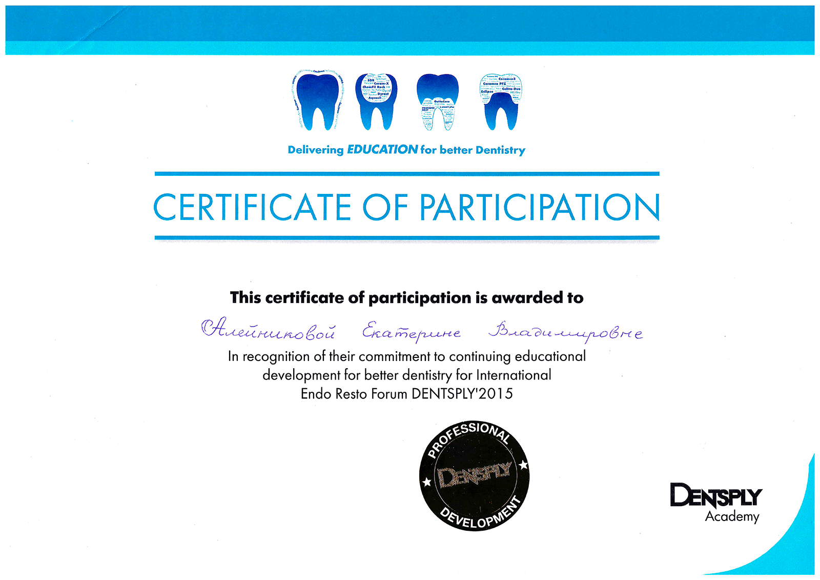 2015г. – Международный форум по эндодонтии и реставрации «Dentsply-2015 «Restodontic days» (г. Минск).