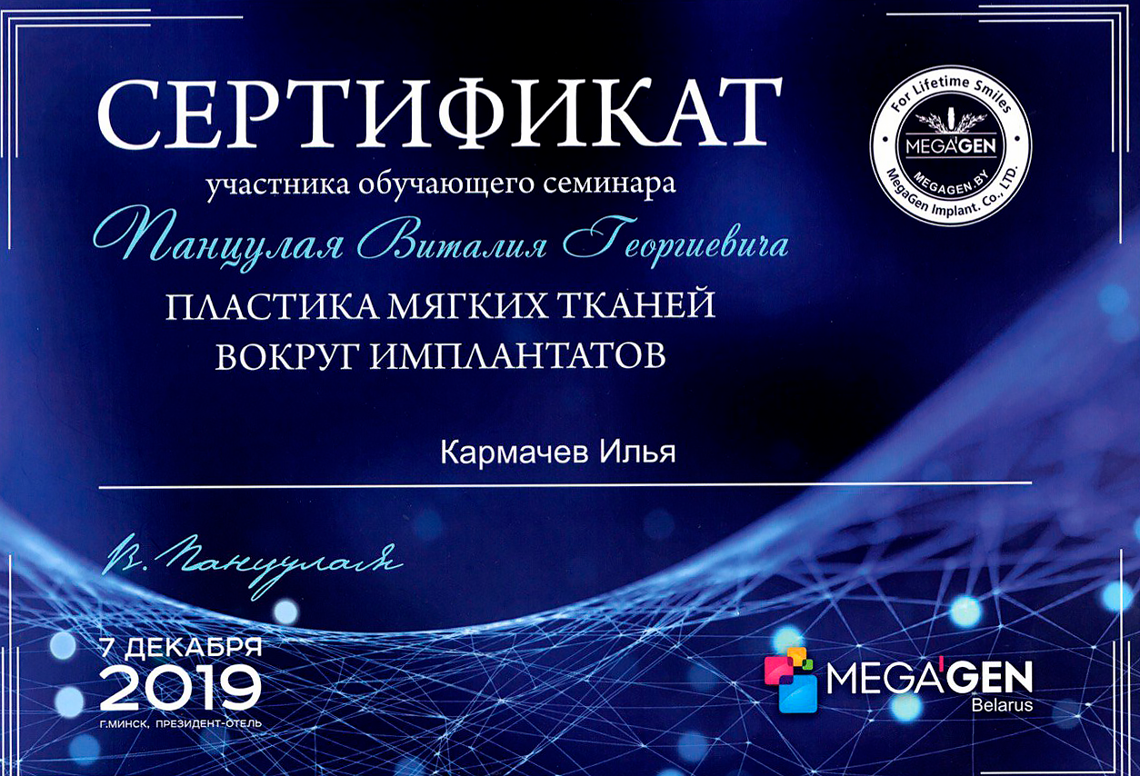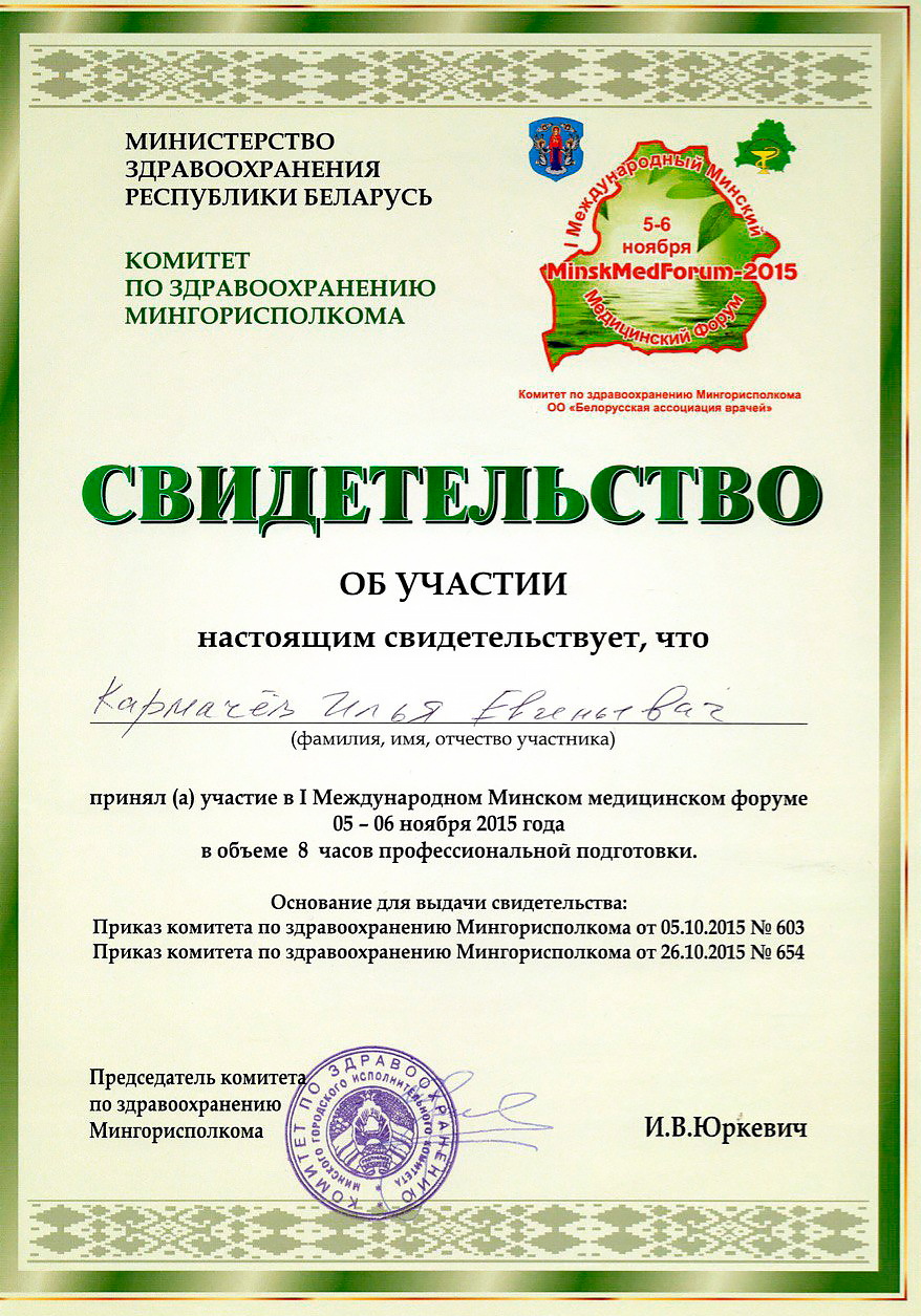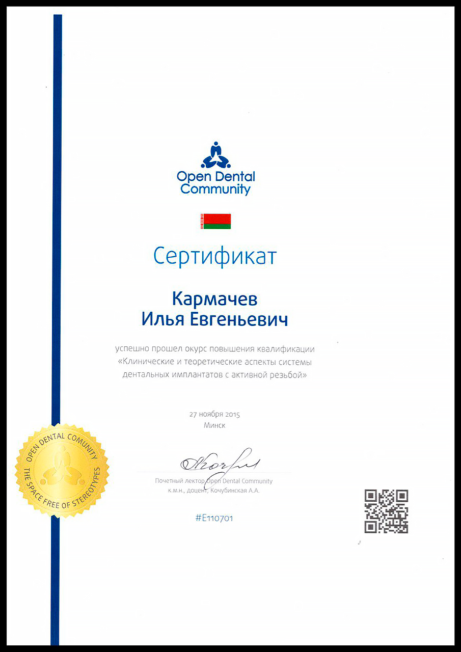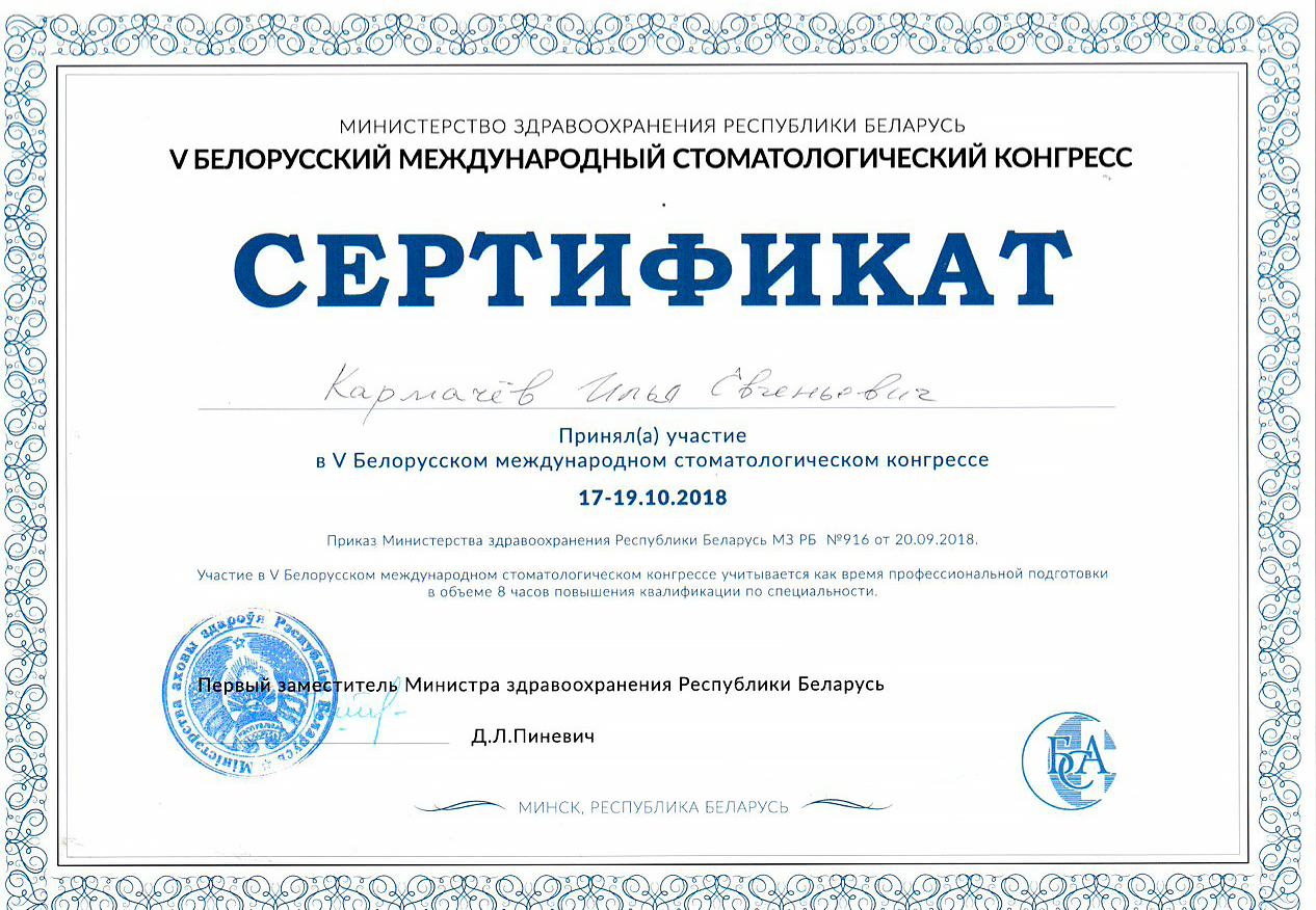 • 2015 г. — «Клинические и теоретические аспекты системы дентальных имплантов с активной резьбой» в БелМАПО, челюстно-лицевой хирург.