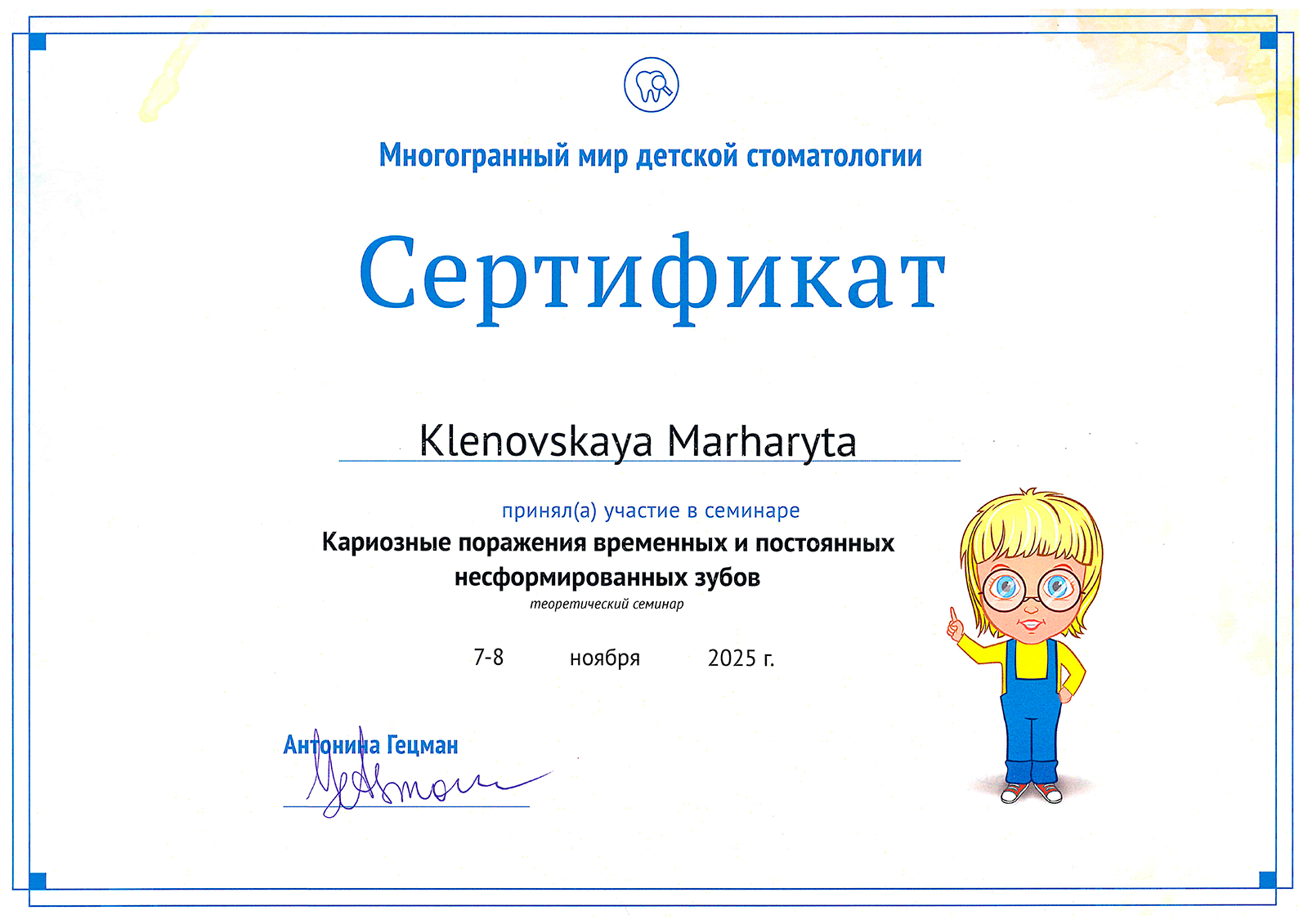 - 06.2008 г. – «Осложненный кариес. Профилактика, диагностика и лечение», кафедра детской стоматологии БелМАПО.