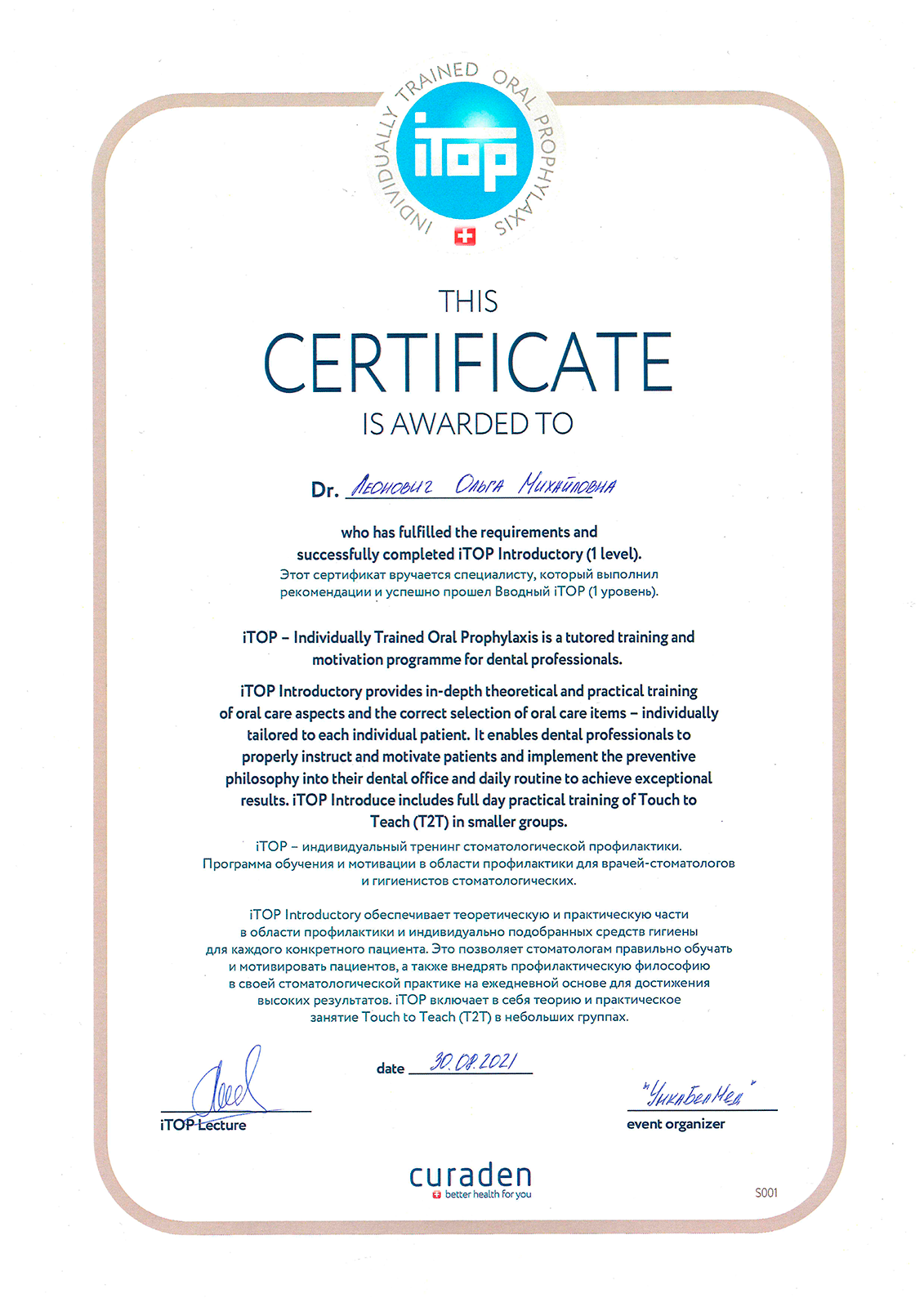 - 06.02.2012–17.02.2012 — «Осложненный кариес. Современные подходы в профилактике. диагностике и лечении кариеса», 80 часов;