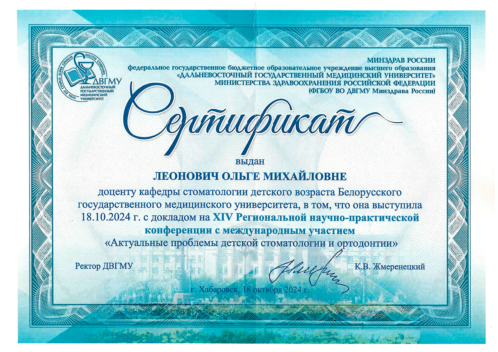 - 05.06.2023—16.06.2023 — «Эндодонтическое лечение временных и постоянных зубов с незавершённым формированием корней», 80 часов.