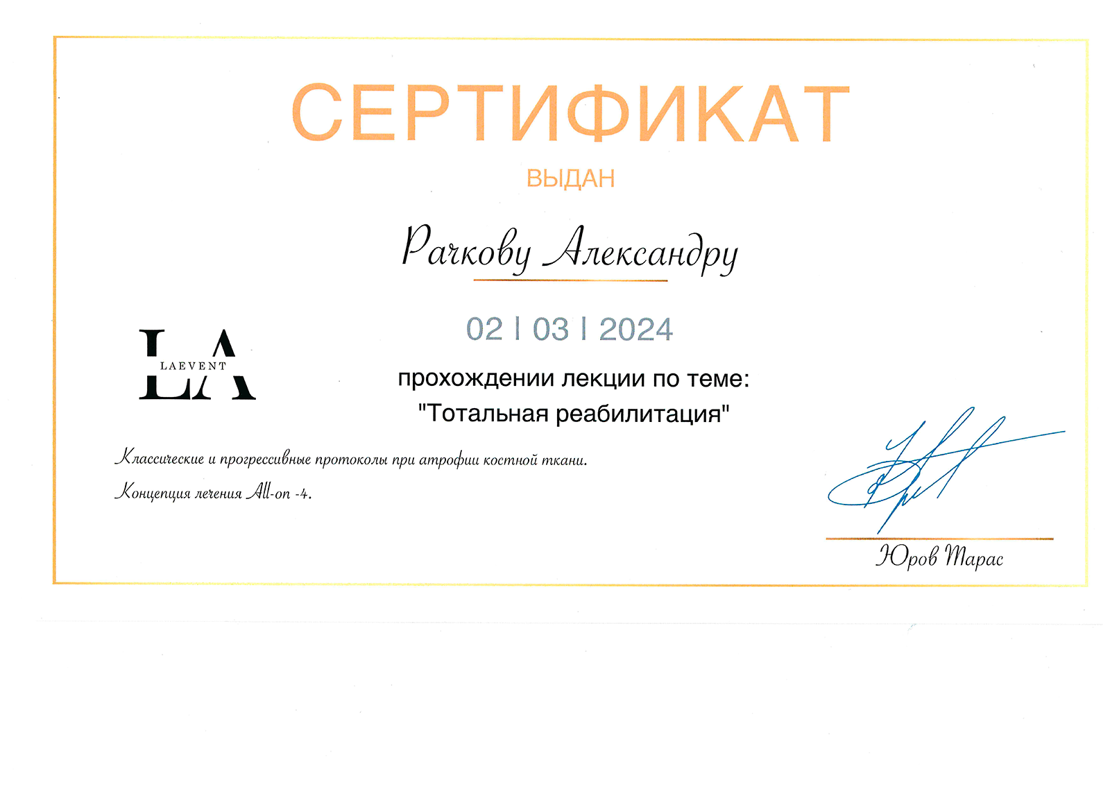Хочу выразить благодарность Рачкову Александру Анатольевичу, стоматологу-хирургу данного центра, за индивидуальный, профессиональный подход. Удаление было произведено максимально внимательно и аккуратно, бережно и заботливо по отношению к пациенту, были учтены все имеющиеся сомнения и переживания. Прекрасно понимаю, что врачам сложнее даётся работать с ипохондриками (такими, как я), но всё же приятно, что врач в данной ситуации встаёт на мою сторону и старается войти в положение. Доктор ответил на все интересующие вопросы и развеял все тревоги. Операция была проведена только сегодня и процесс заживления ещё впереди, но я уверена, что всё пройдет хорошо.