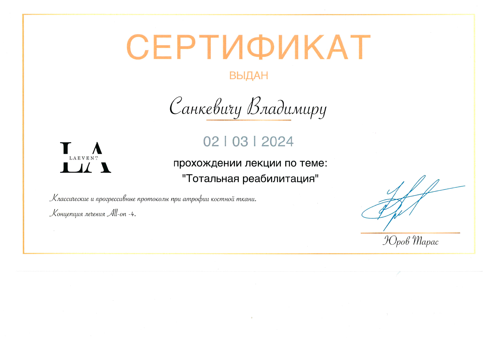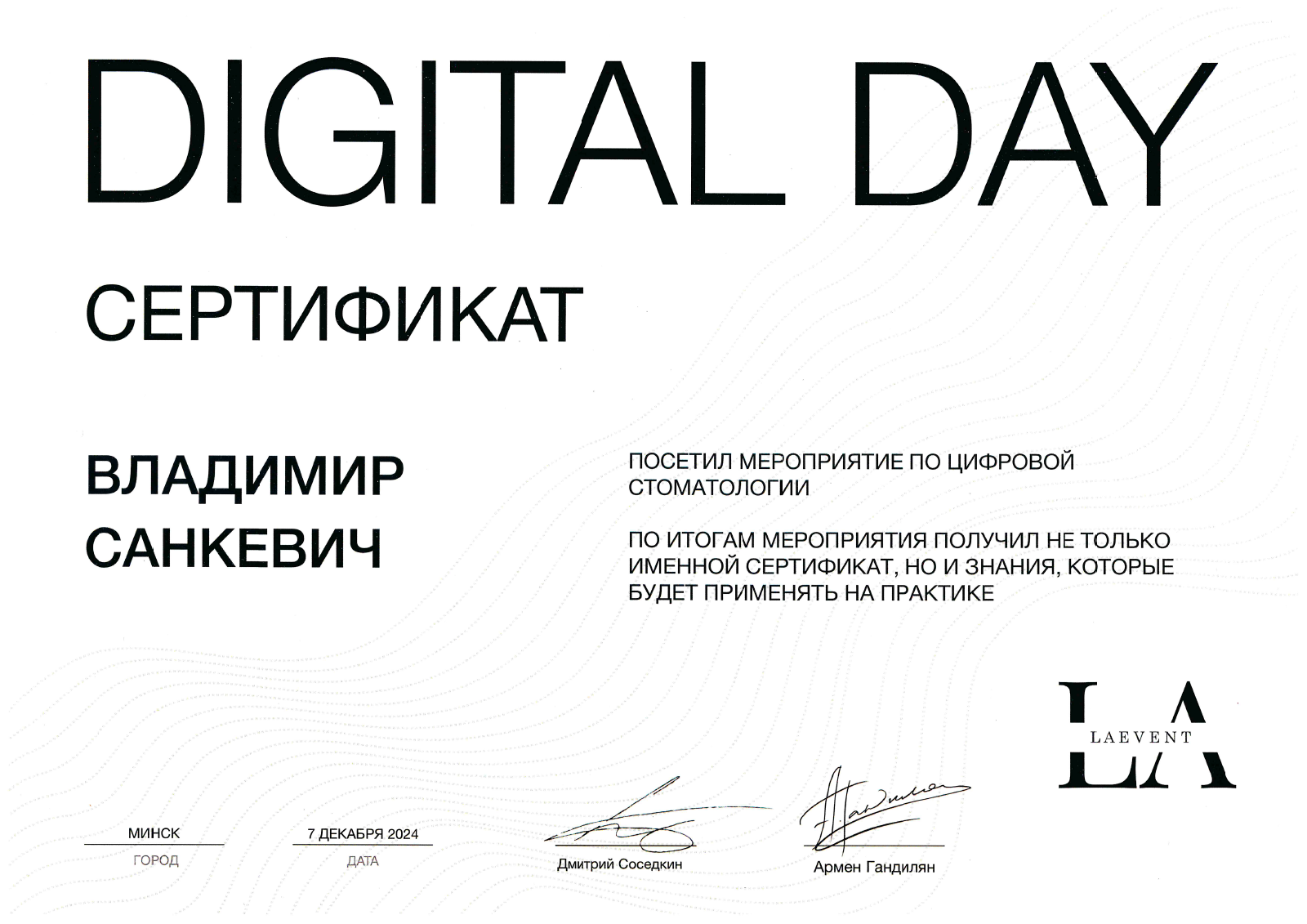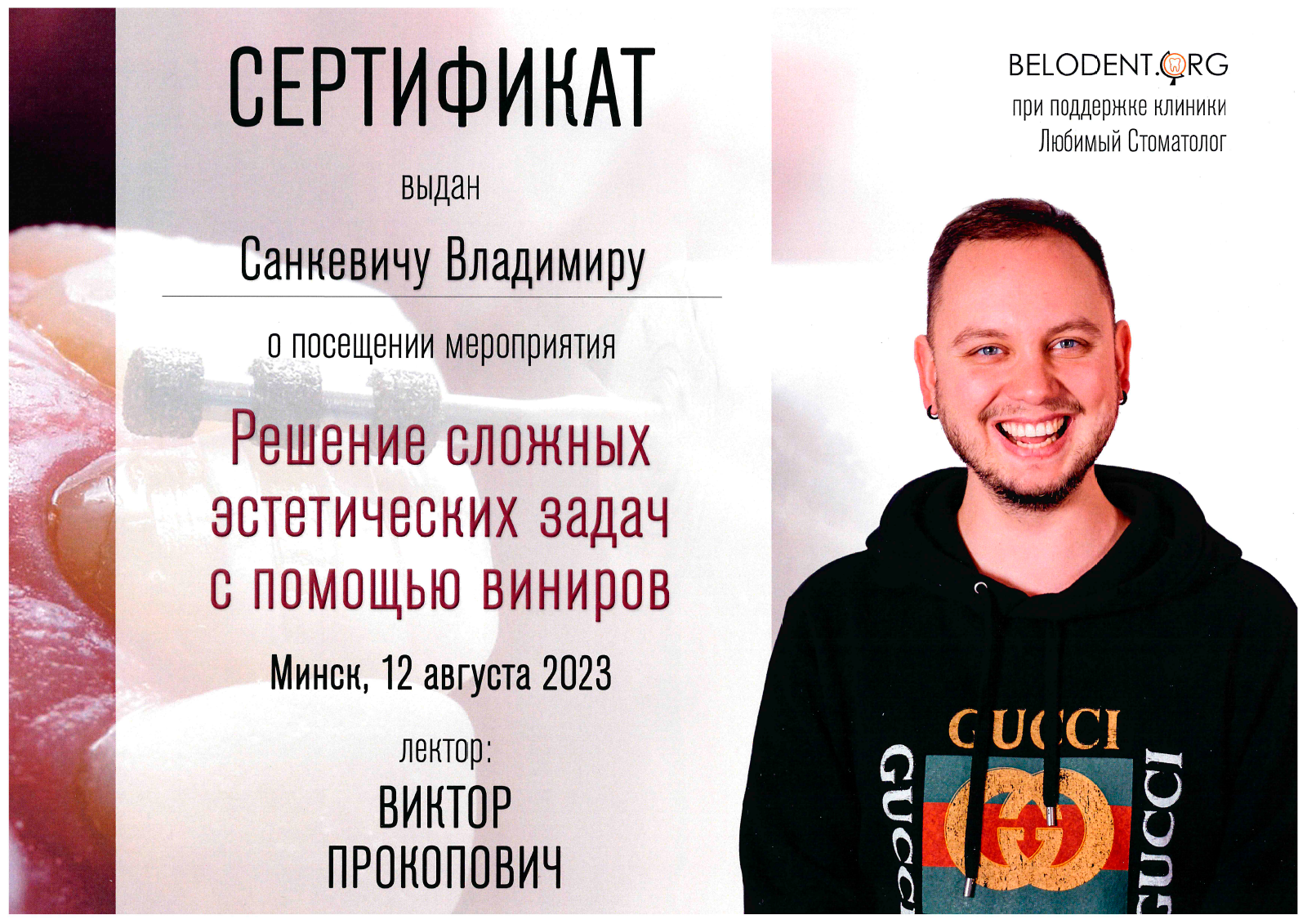 2019 г. — повышение квалификации на базе БелМАПО по программе «Нормализация окклюзии при стираемости зубов».